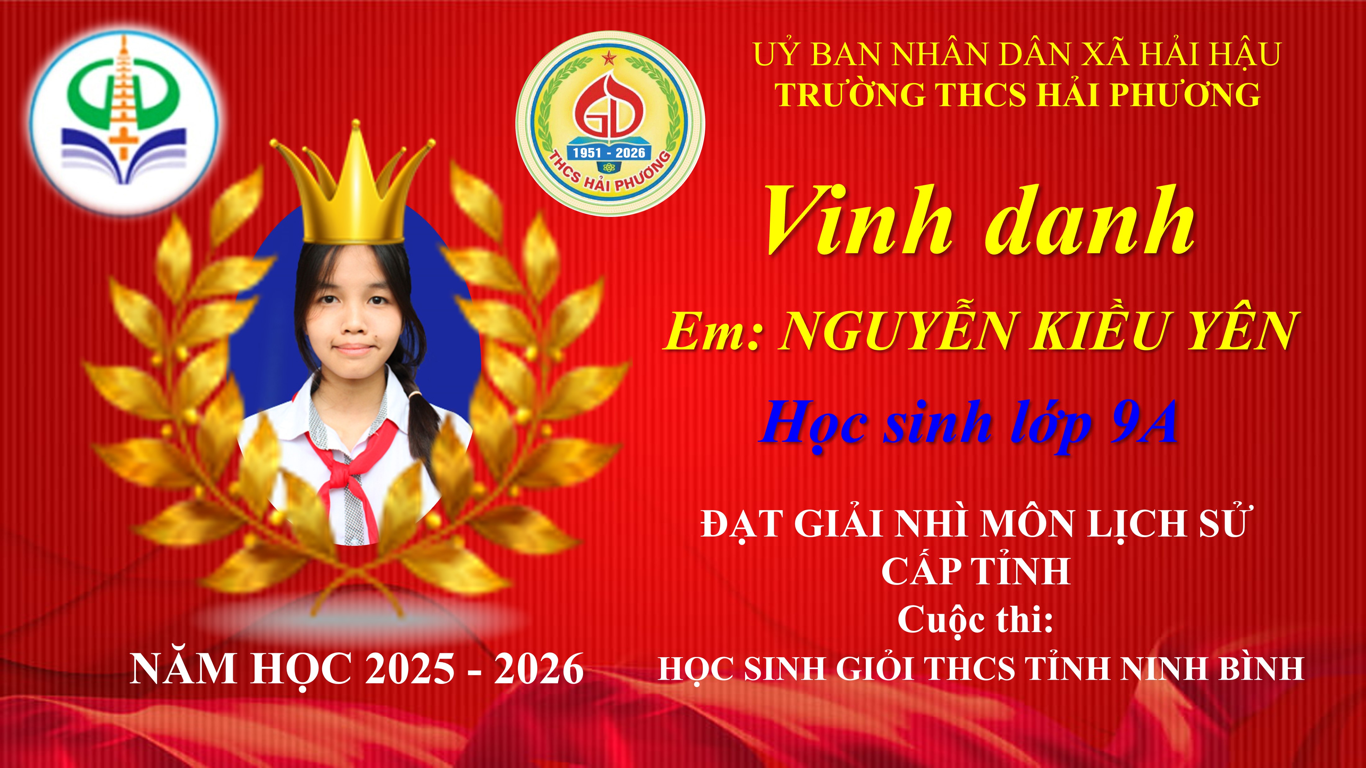 Nguyễn Kiều Yên – Lớp 9A – Giải Nhì môn Lịch sử 9