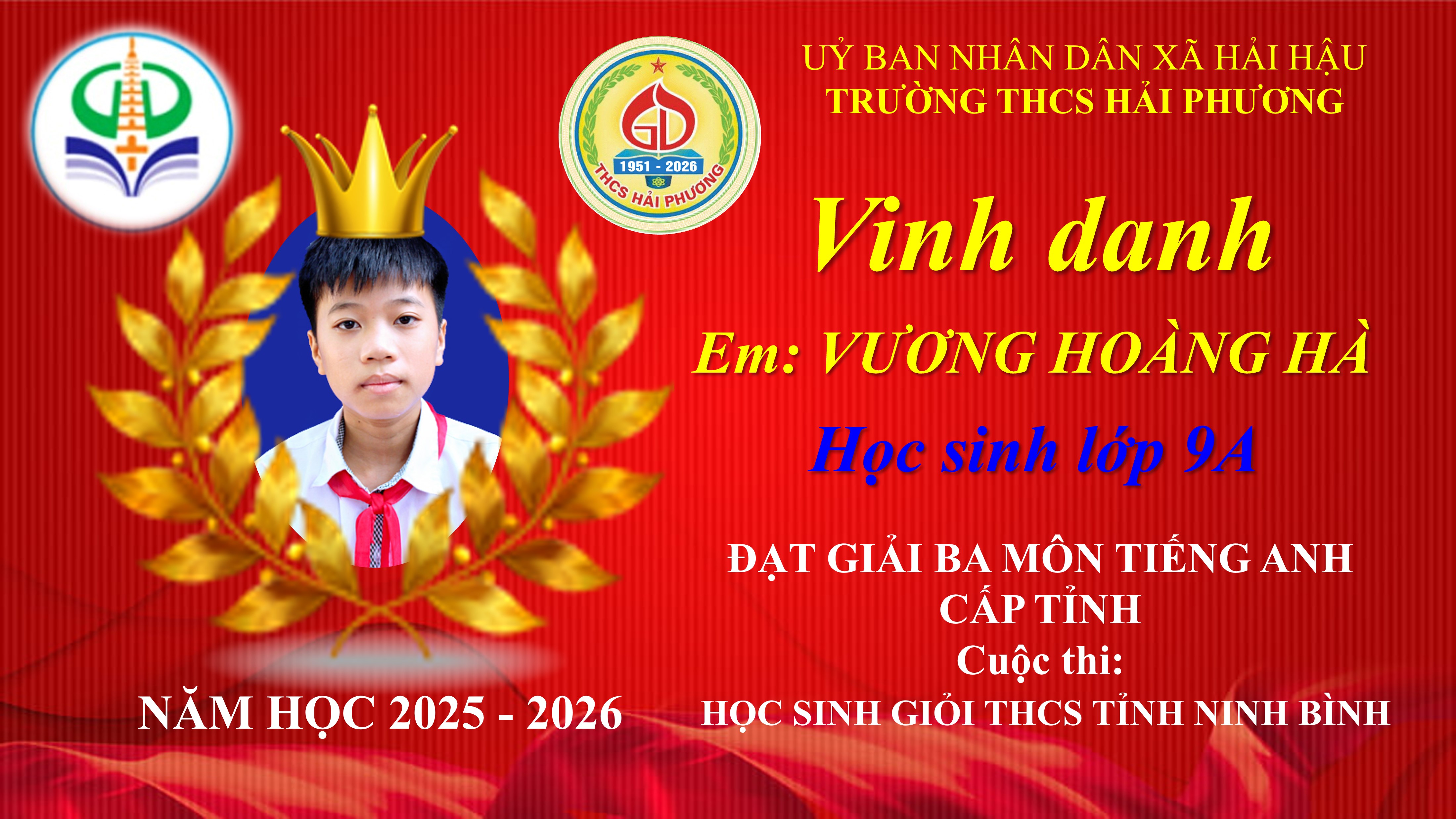Vương Hoàng Hà – Lớp 9A – Giải Ba môn Tiếng Anh 9
