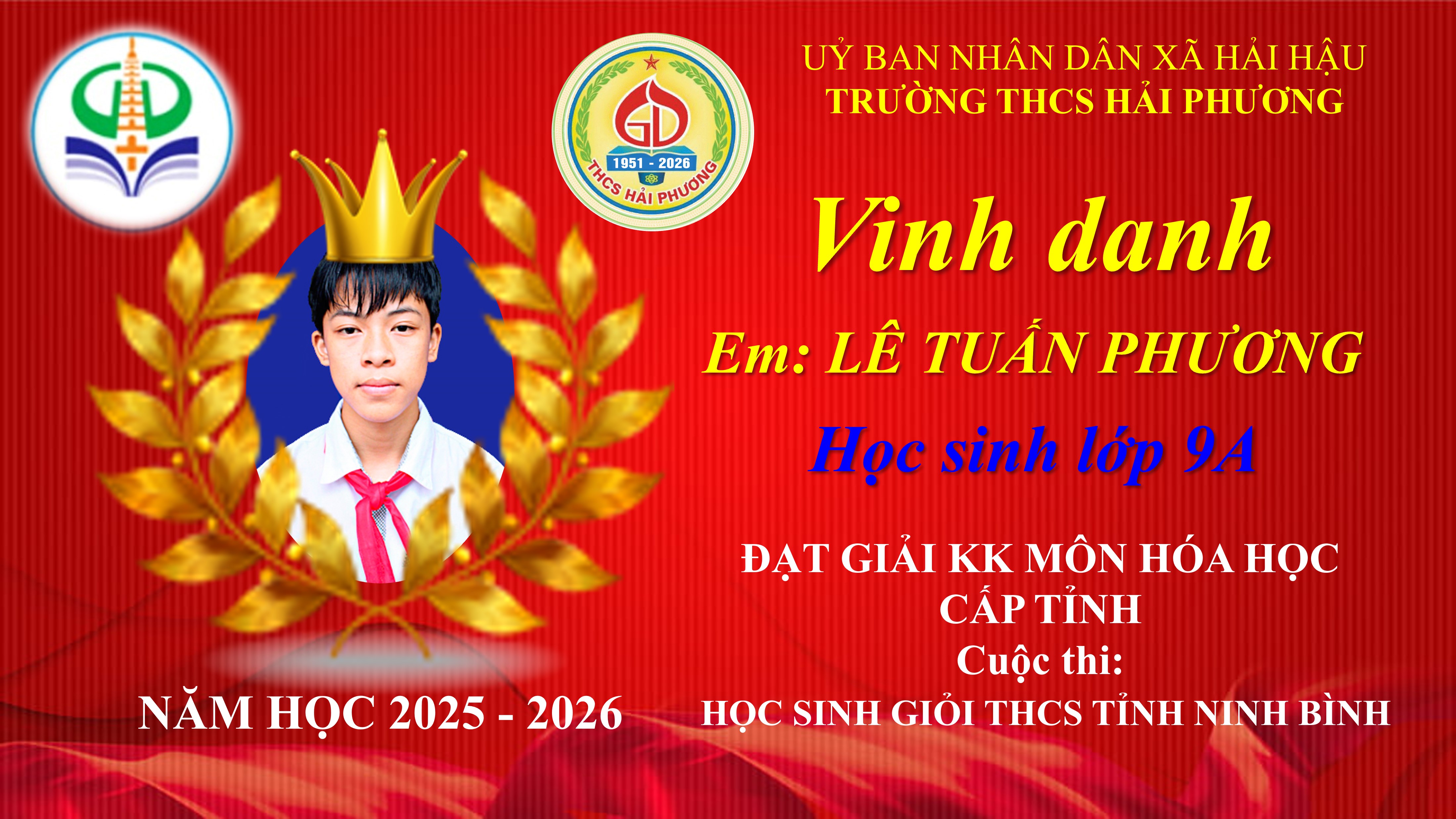 Trường THCS Hải Phương tự hào vinh danh 09 học sinh xuất sắc đã đạt giải tại Kỳ thi chọn học sinh giỏi THCS tỉnh Ninh Bình năm học 2025–2026.